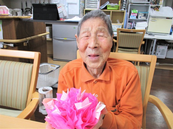 ピンク・水色・紫色の3色の紫陽花です。職員も一緒に各階が競って作っています。