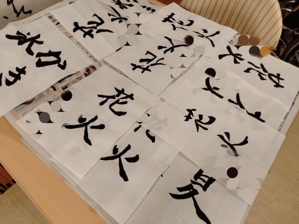 本日は、皆様と一緒に知性や感性を養おうと、日本の伝統文化である「書道」を行いました。