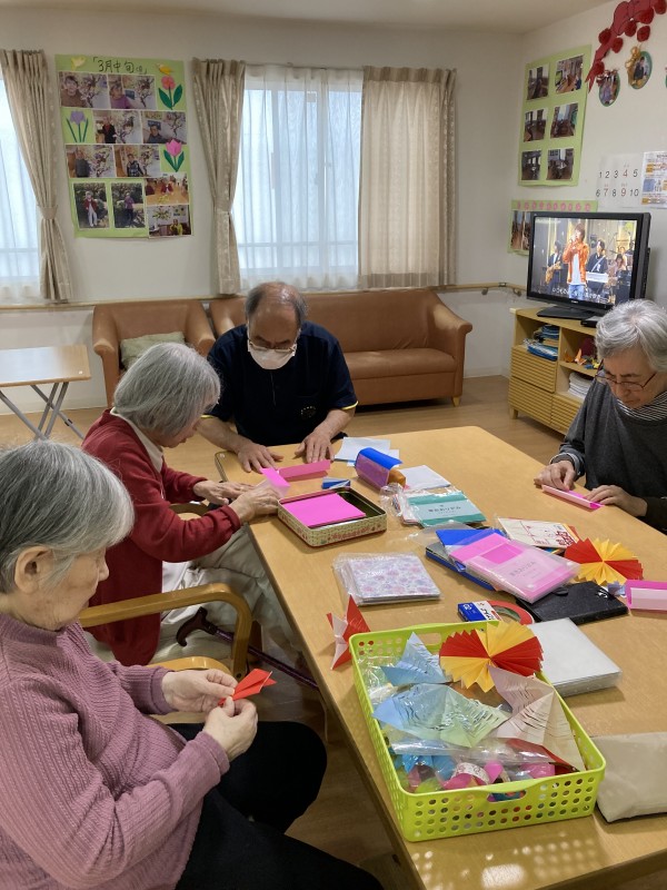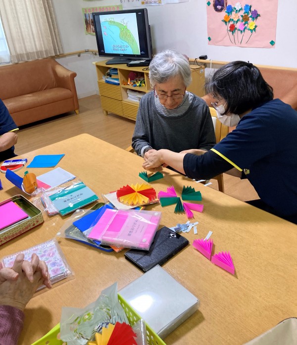 今回は、1階、2階の入居者様一緒に七夕の飾りを作っています。