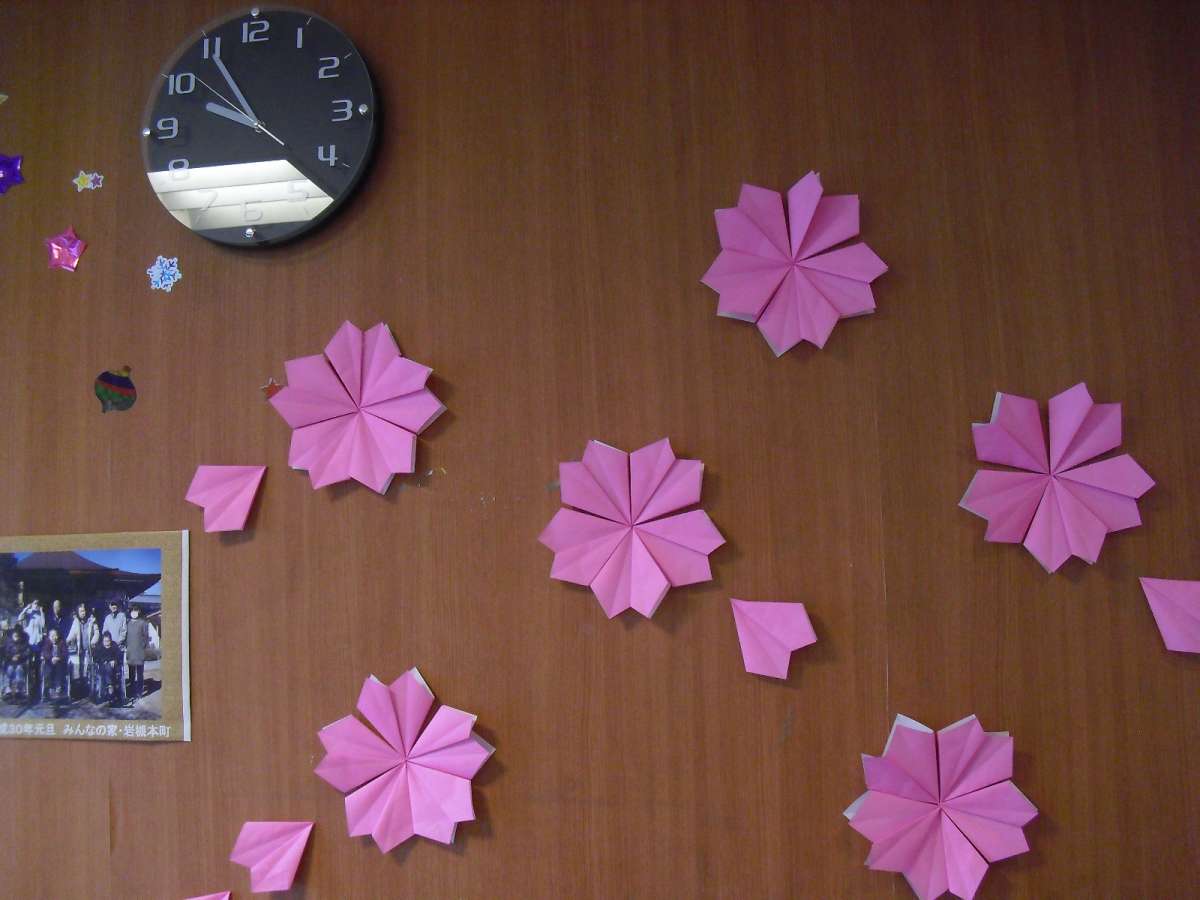 こんにちは☆ここ グループホームみんなの家 岩槻本町では、施設での暮らしが華やかになるように、ご利用者様と職員 みんなで、楽しく壁飾りをつくっております★