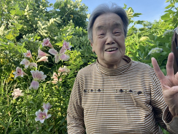 今回は、外気浴も兼ねて、「お花と一緒に、ご入居者様と撮影」を行いましたので、