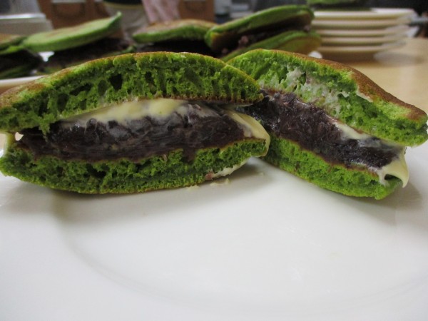 抹茶を入れた生地を焼き、小豆と生クリーム、