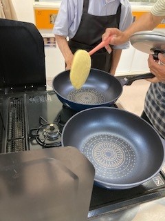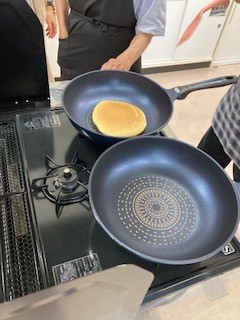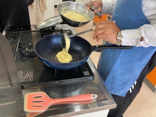 手慣れた手つきでフライパンに生地を投入。