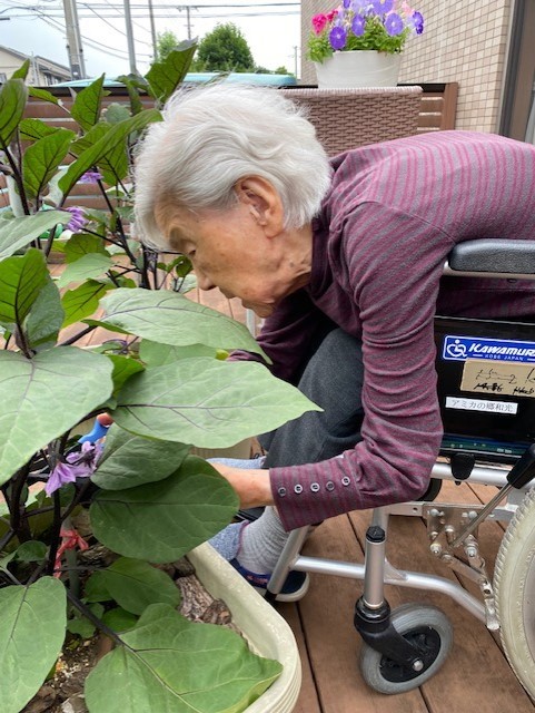 1階テラス内にあるアミカ農園にて「ナスの収穫」しました。ヾ(o´∀`o)ノワァーィ♪