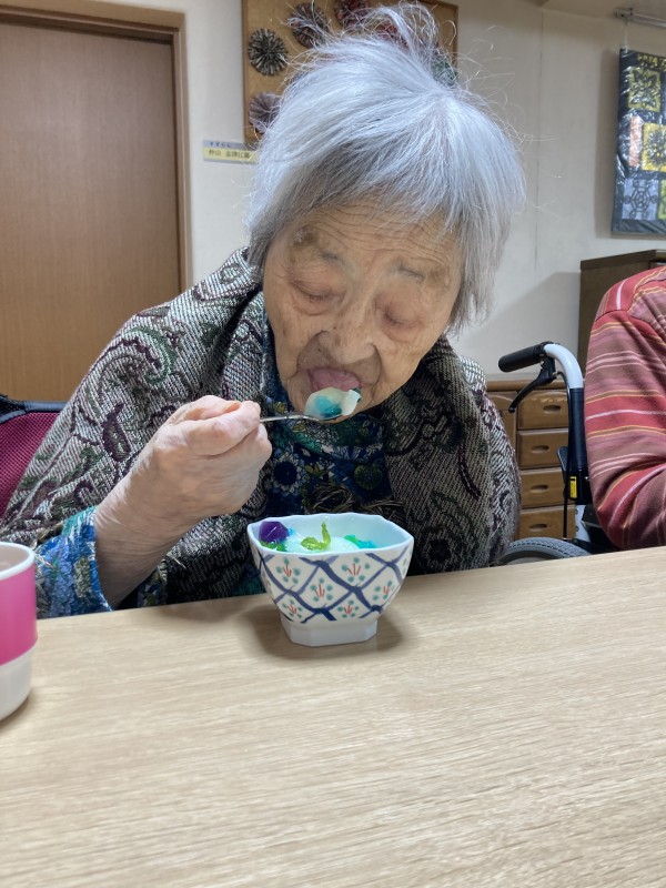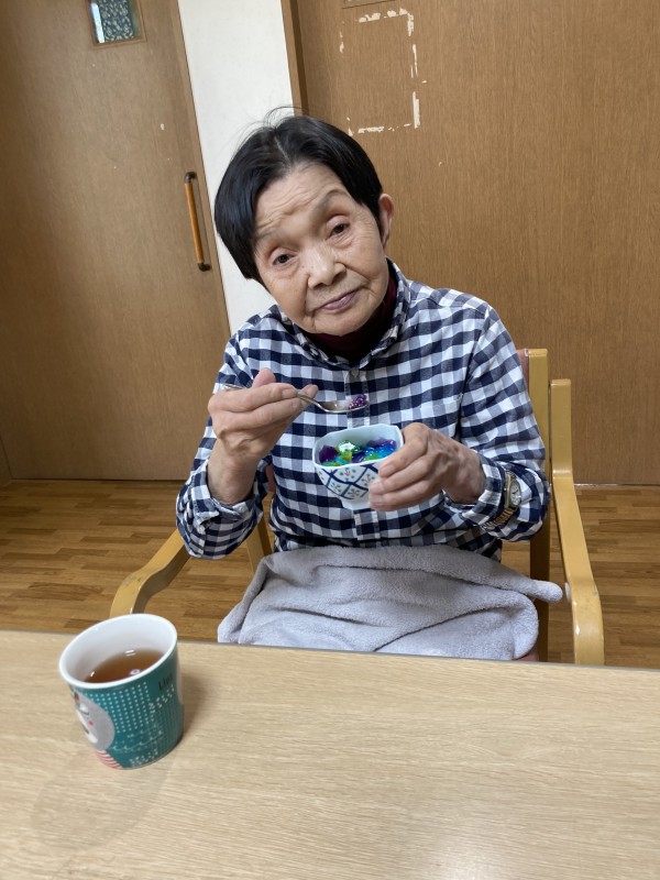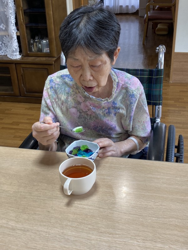 杏仁豆腐を器に乗せ、冷えた寒天ゼリーで、はい「紫陽花ゼリー」の出来上がり!