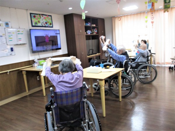 今日はリモート運動教室タオル体操の日、今月三回目のリモート全館同時開催です。