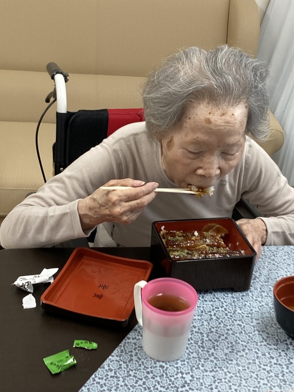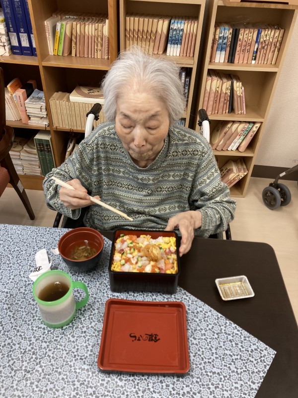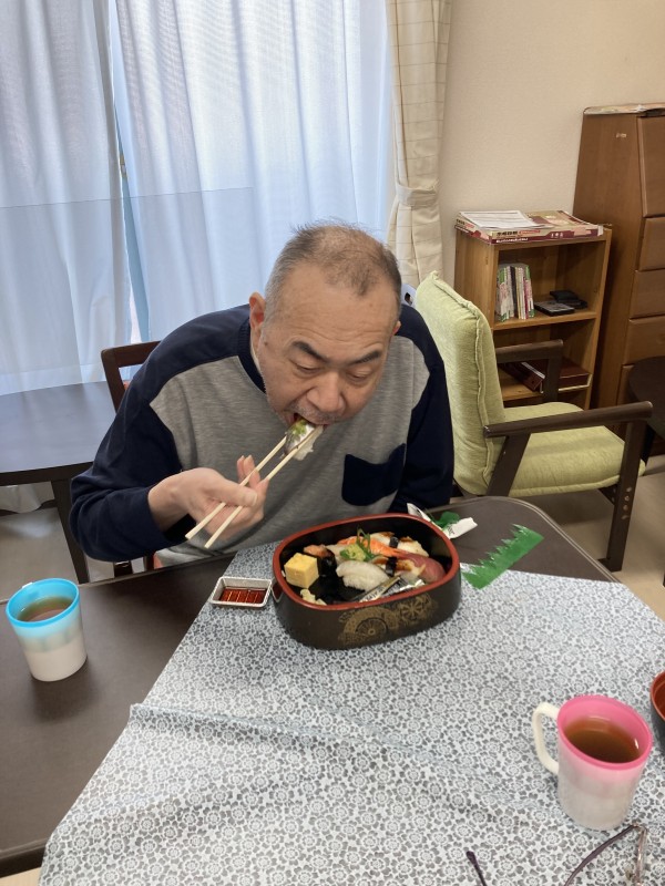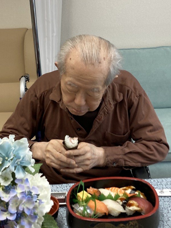 事前に今月誕生月を迎える皆様に好きな物を選んで頂き、出前を取って食べて頂くというスタイルの誕生日会を行っております。コロナ渦でなかなか外出する事が難しかったり、好きな物が食べられない状況が続いていますので、せめて誕生月位は好きな物を召し上がって頂きたいと思います。やっぱりお寿司や鰻が人気です。