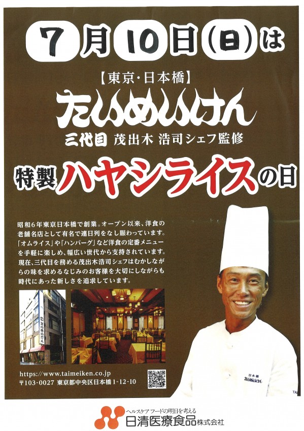 東京・日本橋「たいめいけん」のハヤシライスが、7月10日(日)の昼食に登場します。