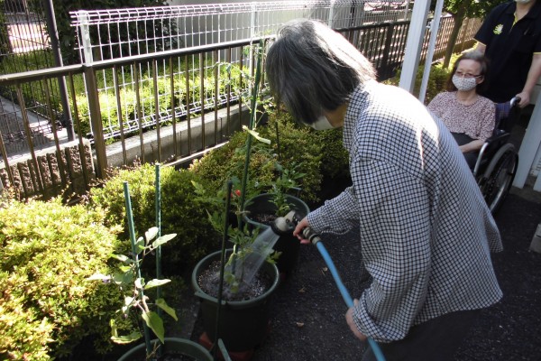 「野菜だけじゃなくてこっちもあげないと…」と隣のツツジ?の木にも水やりをして頂きました。