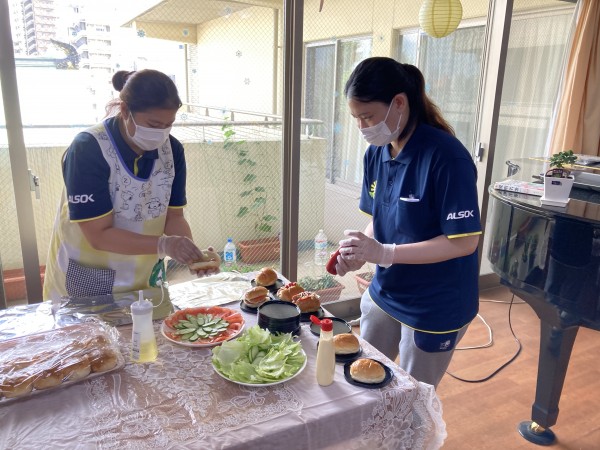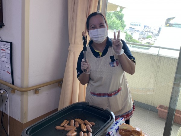 黒木ケアスタッフが焼いたソーセージを野菜と一緒にパンに挟む三上ケアスタッフ。