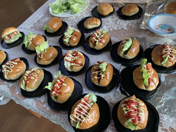 お野菜と焼きあがったソーセージをパンにはさんで、ケチャップとマヨネーズを