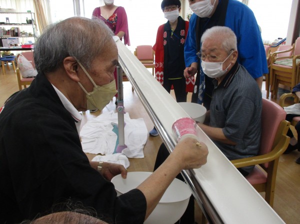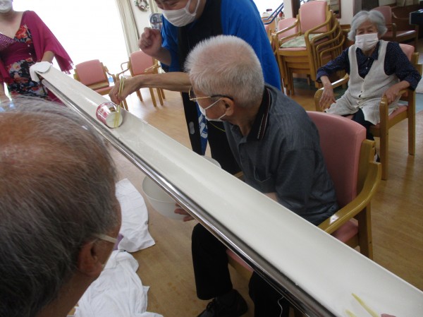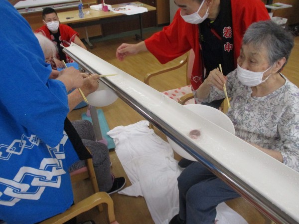 そんな職員の気持ちから7月7日のレクリエーションは、そうめん流し、ならぬ、うまいもの流しを行いました!!