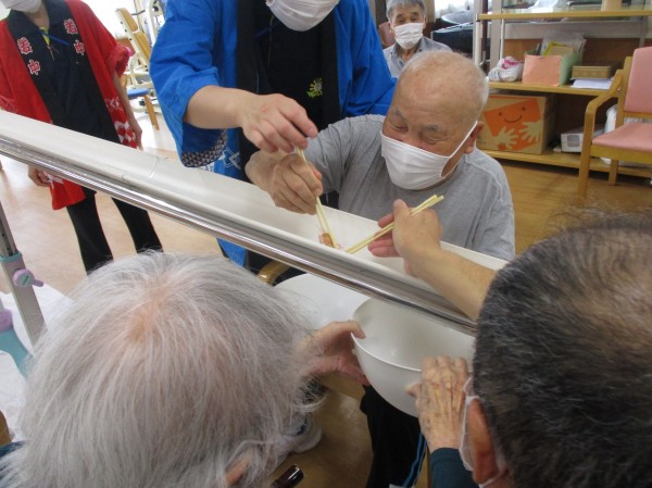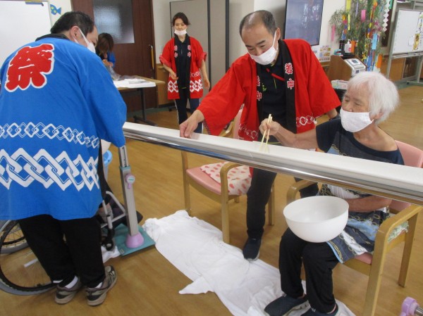 デイサービスセンター遊・志木上宗岡ではそうめんを流す代わりに、袋に入ったおやつを流し、四苦八苦してもらいながらすくっていただきました(^^)/