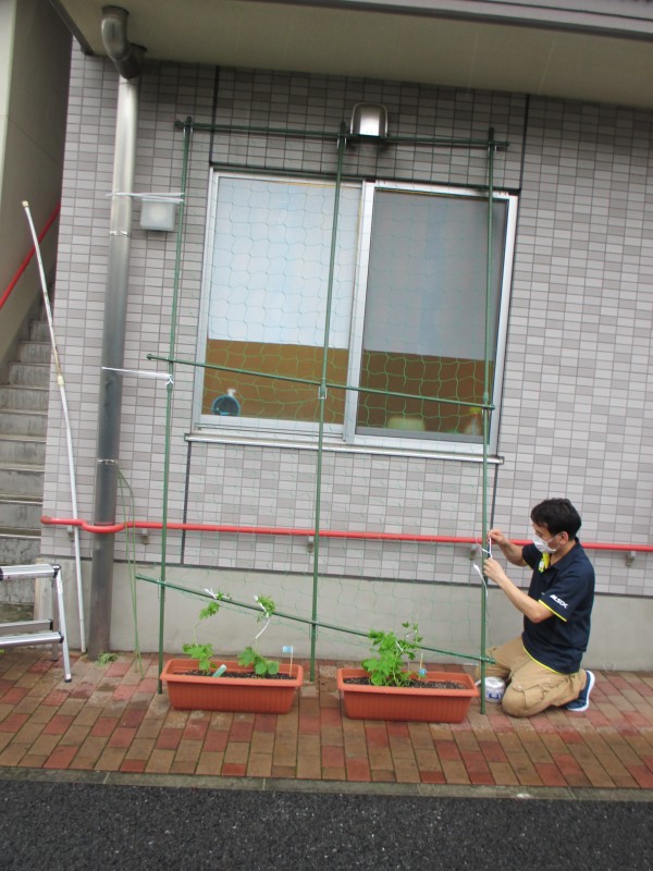 そしてホーム長がグリーンカーテンを買ってきてくれたので、スタッフTとスタッフYあとホーム長で作成しました°˖✧◝(⁰▿⁰)◜✧˖°