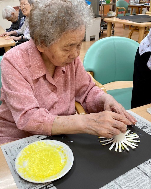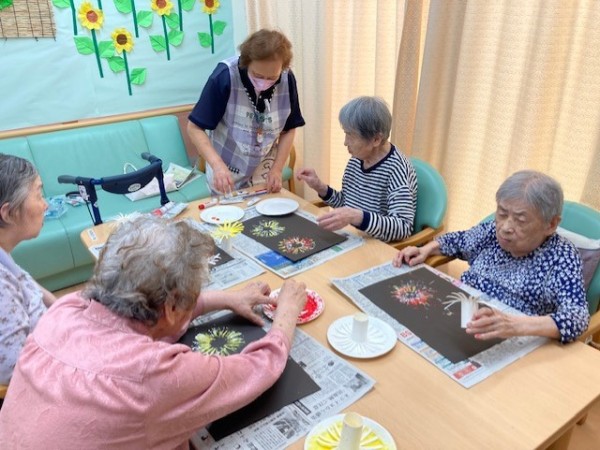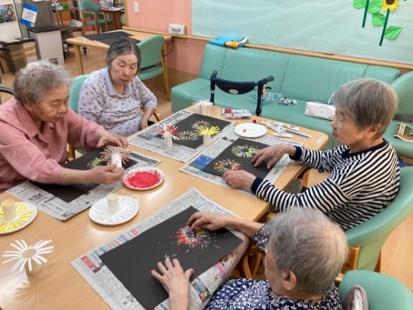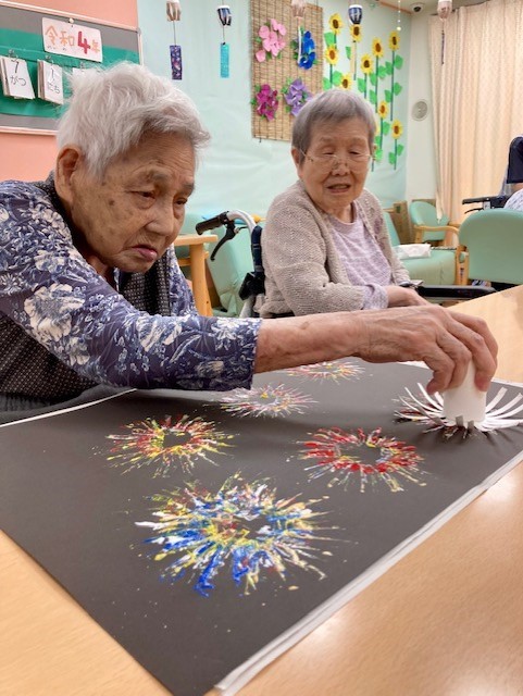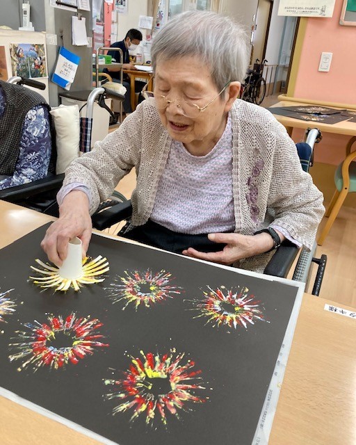 グループホームみんなの家・墨田では、花火の壁飾りをご利用者様に「手作りスタンプ」で作って飾りました。