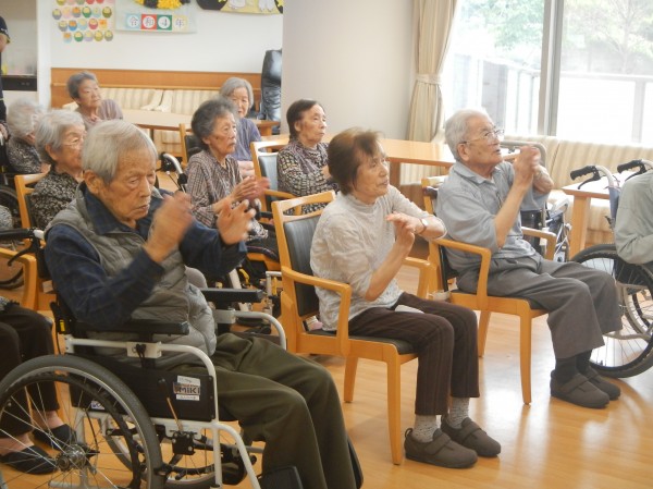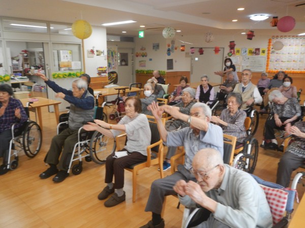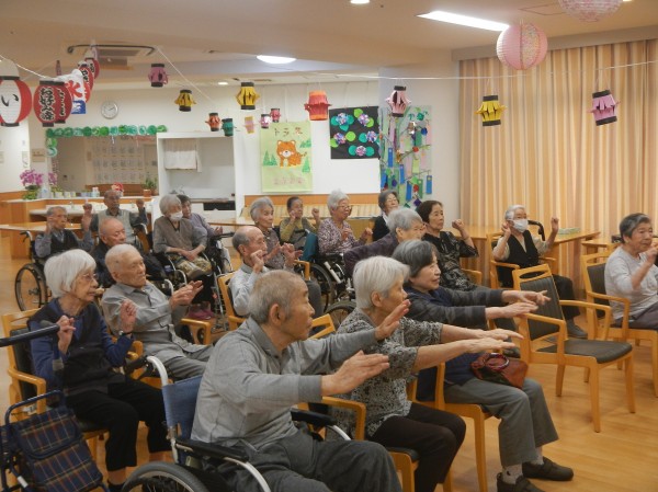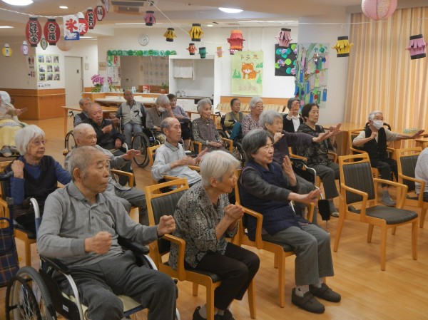 お囃子に盆踊りの音楽が流れると、ホールに集まったご利用者様は、自ら体を動かし準備OK!