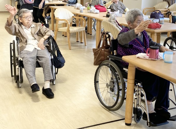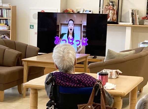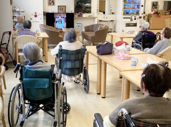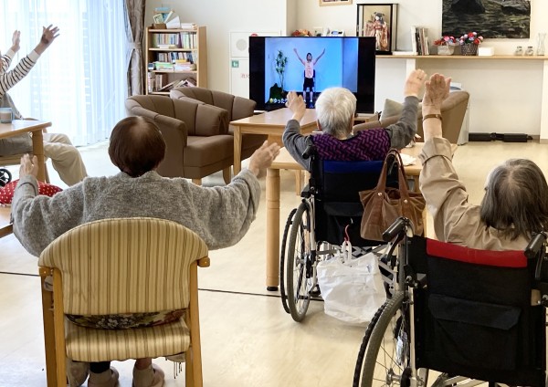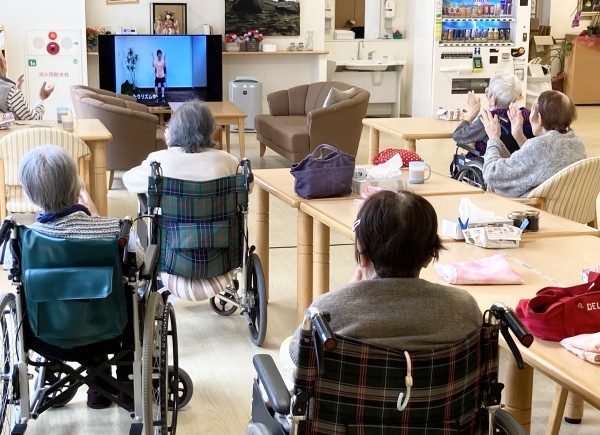 本日は自社の健康増進サービス課が作成した、新しいDVDを見ながら「いきいきリズム体操」「お食事前のヨガ」を行いました!1Fのご様子です。