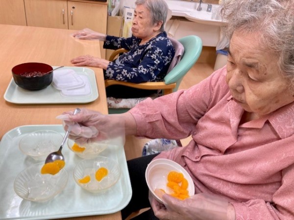 グループホームみんなの家・墨田では8月8日におやつに向けて、皆さんで冷たい「あんみつ」作りをして召し上がりました。