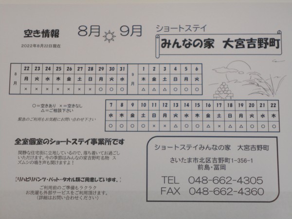 今週も空き状況をお知らせいたします。どうぞよろしくお願い申し上げます。