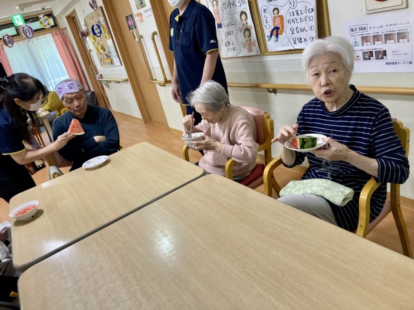 輪になって、皆で順番にすいかを