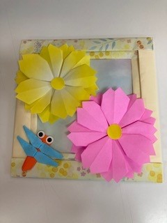 今回の折り紙のテーマは【コスモスのリース】。額とコスモスを作成しました。人により折り紙の柄が違うので、