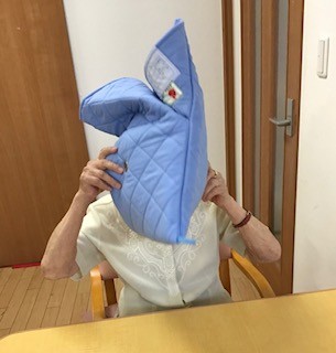 かぶり方を皆さんで練習しました。