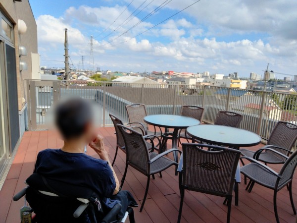 時間は14時50分、5分程度ですが、バルコニーにて、ご入居者様念願の日光浴をしていただきました。