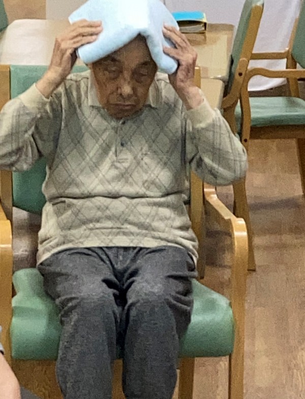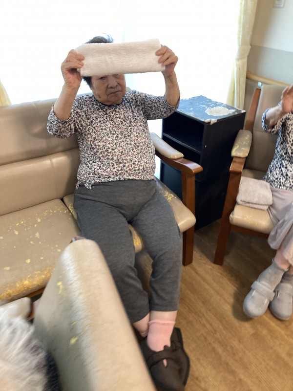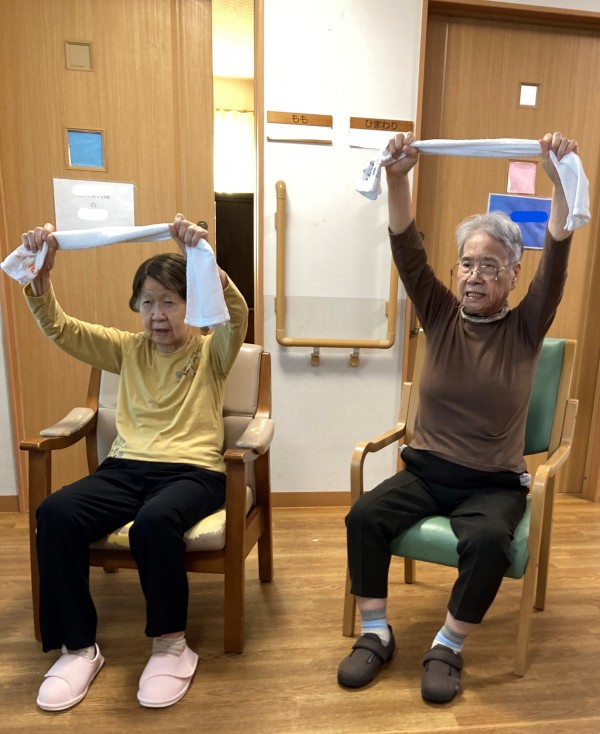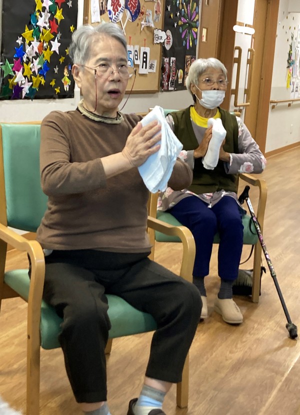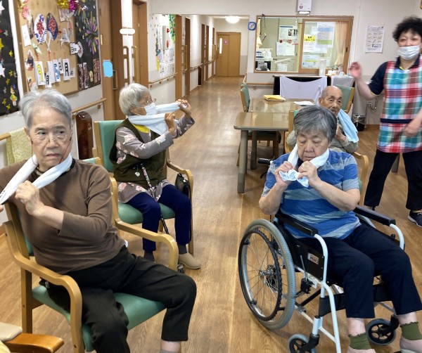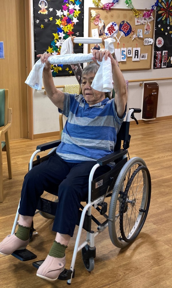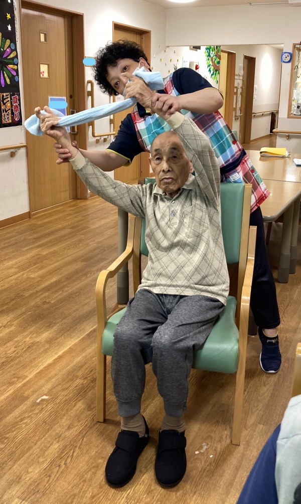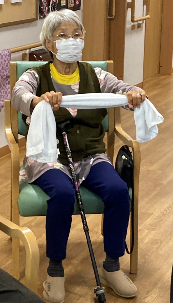 タオルを首に巻いて身体を捻じる体操の時にとある利用者様は首に巻くだけでしたが、行なってくださいました。