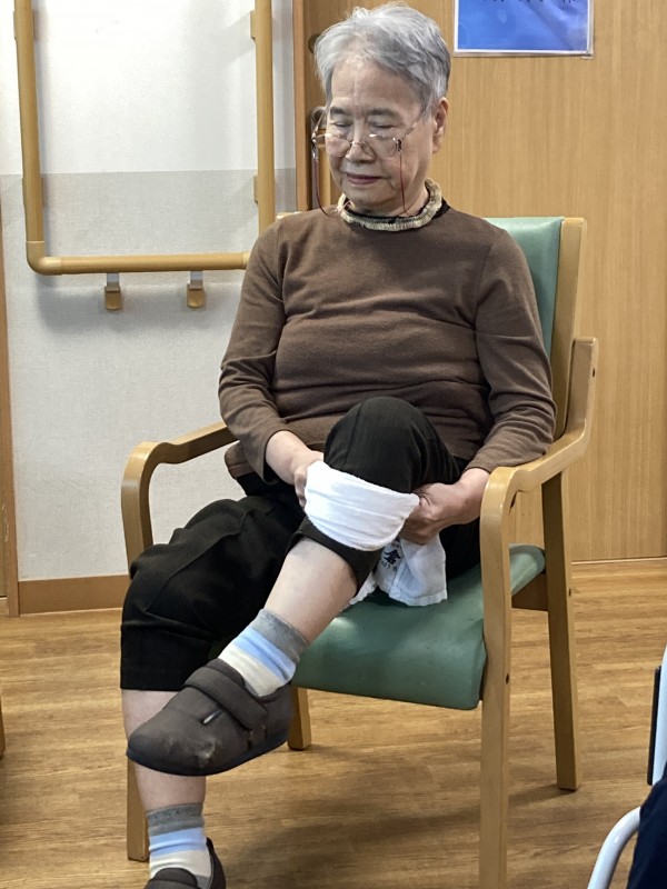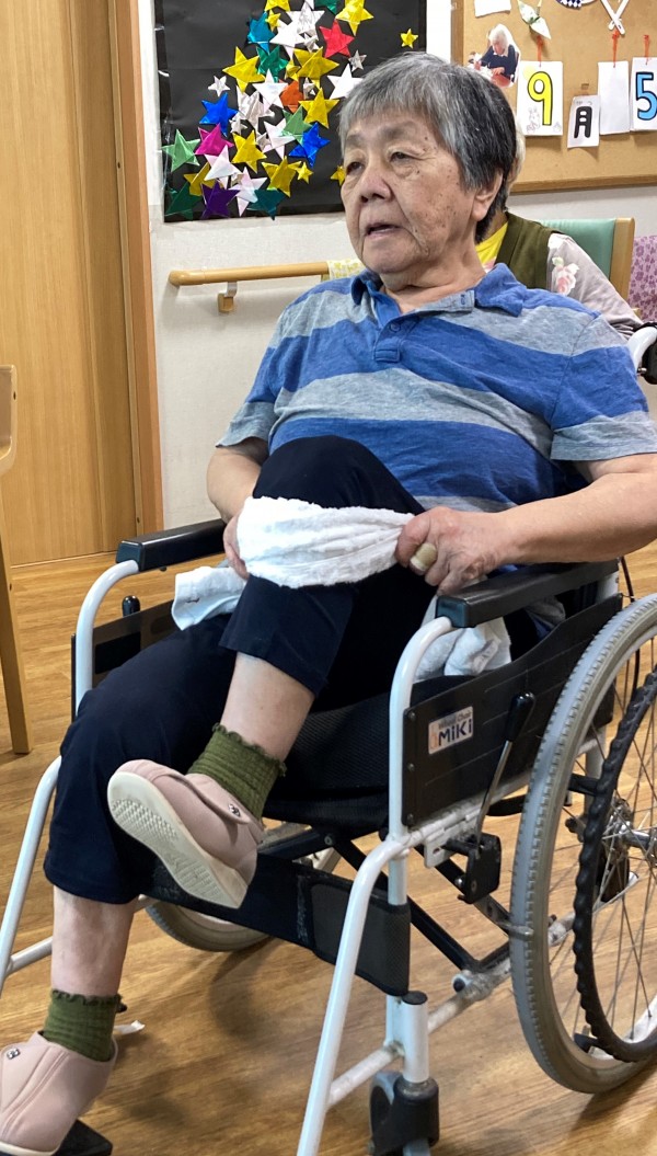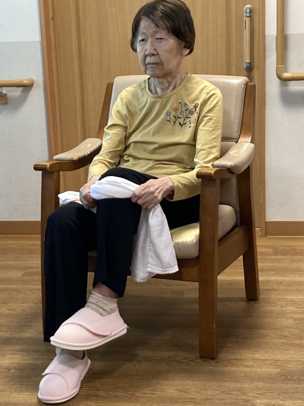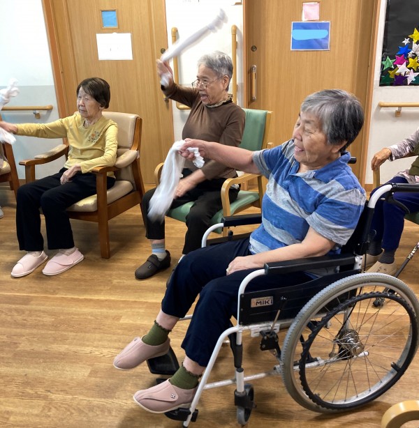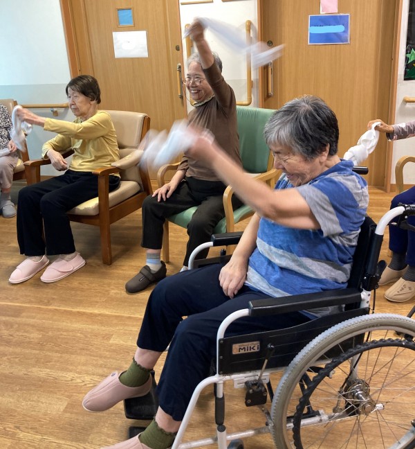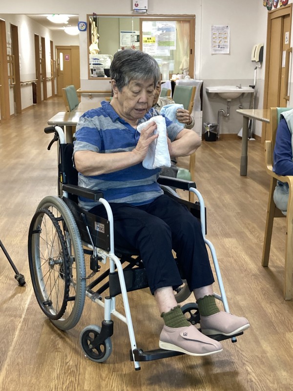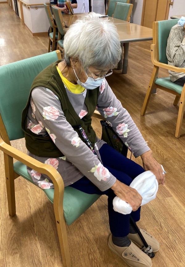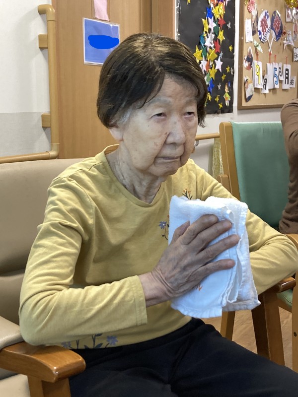タオルを首に巻いて身体を捻じる体操の時にとある利用者様は首に巻くだけでしたが、行なってくださいました。