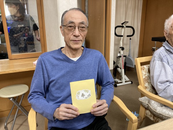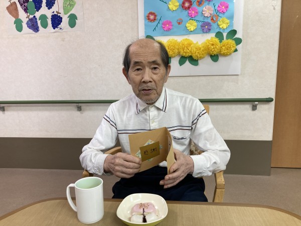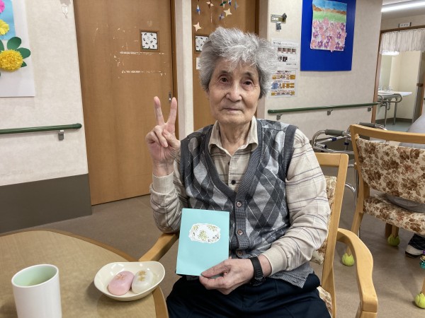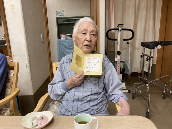 紅白のお饅頭と手作りの敬老カードを感謝を込めてお渡ししました。