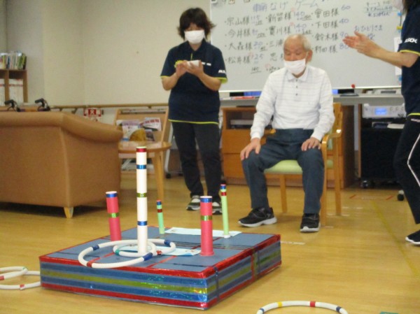 こんにちは、デイサービスセンター遊・西東京です。今日の運動レクレーションは『輪投げ』です!