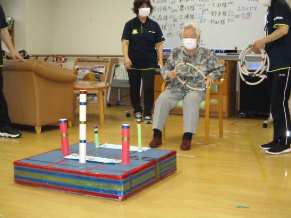 9か所の数字が表示している版に輪っかを投げ獲得した点数で競いました。皆さん慣れた手つきで輪っかを投げられました。がんばれ!!!