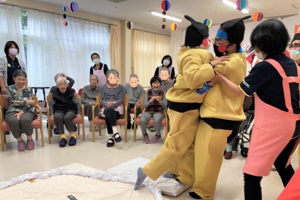 ホーム長からの挨拶はサクッと終わり、獅子舞のような珍妙な動きで登場するスタッフ♪