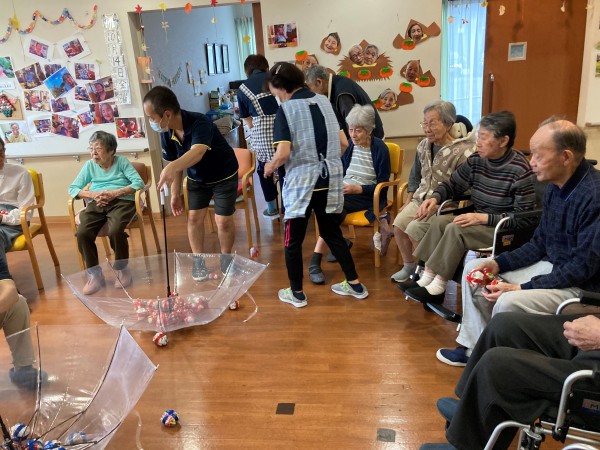 赤チーム、青チームそれぞれ傘に向かって玉を入れた個数で競います