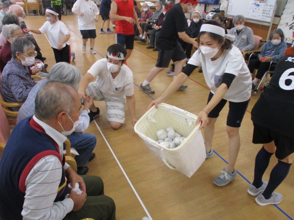 各チームの職員による応援合戦を行った後、次の種目!「玉入れ」を行いました!