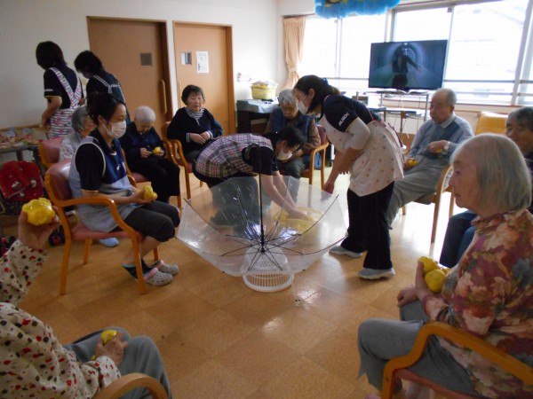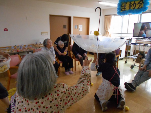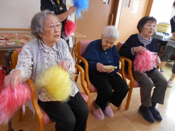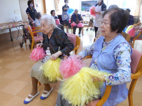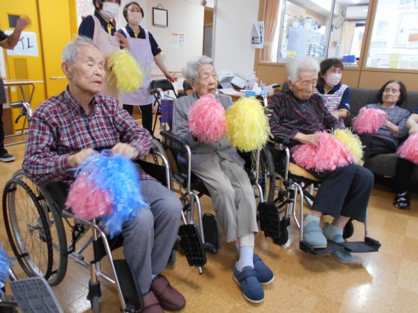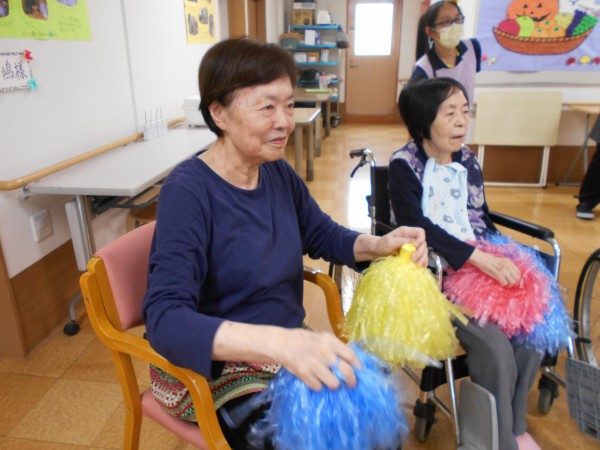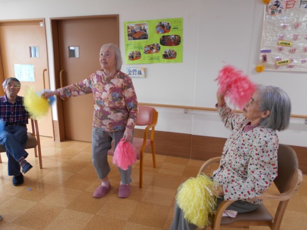 パン食い競争のあとは・・・。午後に行われる玉入れの練習&皆様でポンポンを持って「きよしのズンドコ節」を踊りました('ω')ノ