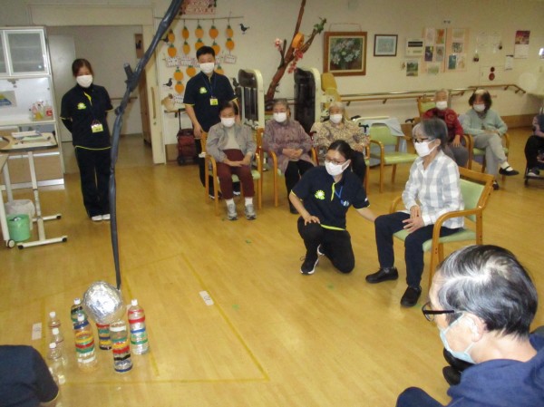 こんにちは!デイサービスセンター遊・西東京です!今日の運動レクレーションは『空中ボーリング』です。