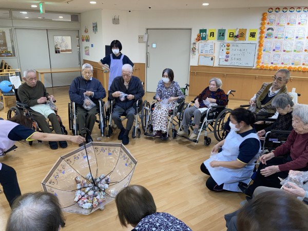 玉を拾う職員、投げるご利用者様と、傘に大量の玉の雨を降らしリベンジ成功!