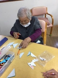 折り紙を小さくたたんで、お花作りの始まりです♪