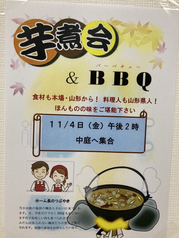 当日は近隣ホームのホーム長がお手伝いに来てもらえる事になっています。このホーム長は山形出身で、山形から芋煮の材料を取り寄せて作ってくれる事になっています。芋煮だけでなく、BBQや燻製機を使っての調理も予定されているので、盛り上がると思われます。また、普段は見られない職員の姿も見られると思います。みんなの家・中央区円阿弥ではレクの充実を目指し皆様に少しでもお楽しみ頂きたく思いますので、今後ともよろしくお願いします。