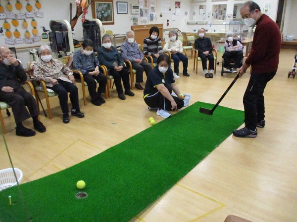今日の運動レクレーションは『パターゴルフ』です!色々な種類のボール10個を使ってホールインさせるゲームです!
