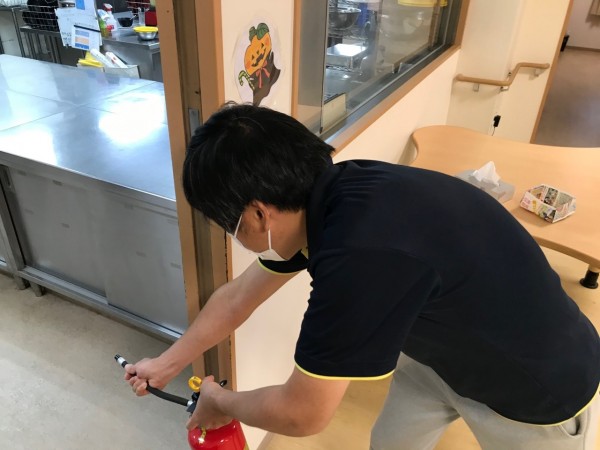 【写真】1階厨房から火災が発生したため(想定訓練)、消火器による初期消火を開始している様子です。