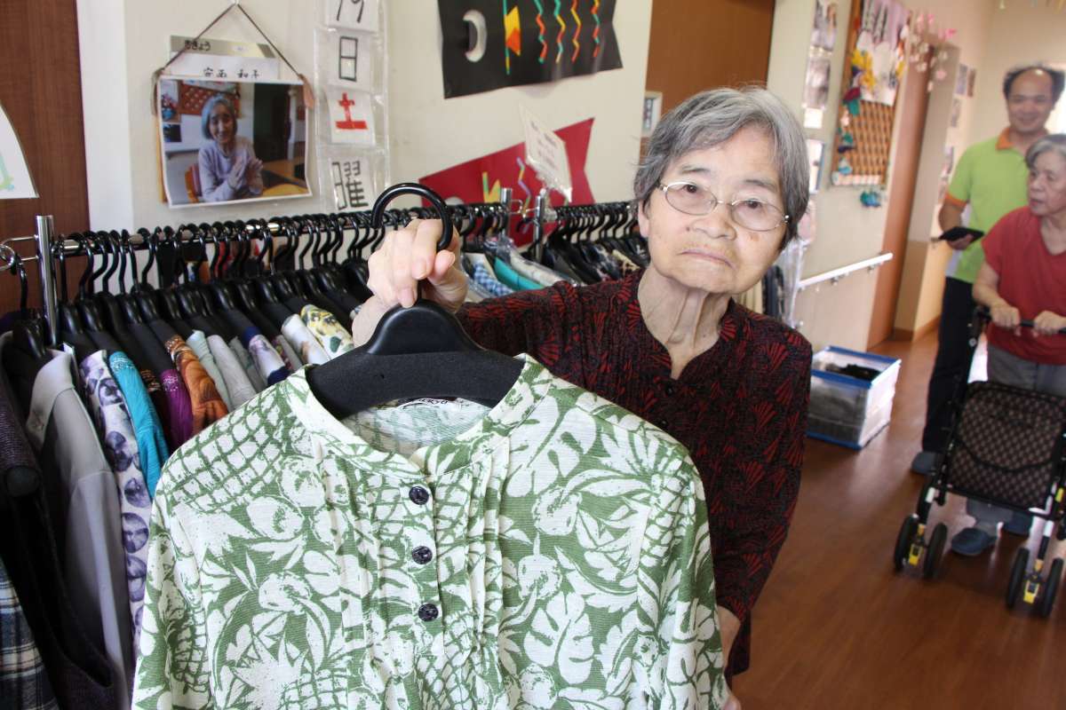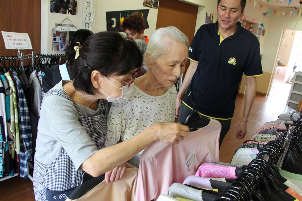 皆様、色々服を手にとっては、鏡に向かいチェックされ、職員に「似合うかしら」など