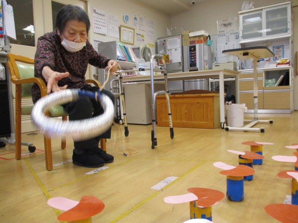 紐の付いた輪っかできのこを狙い撃ち!時間内に自分の手元に引き寄せた分が得点となります。皆様、何度も輪っかを投げては引き寄せます。