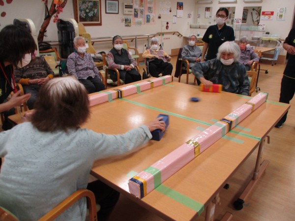 今日の運動レクレーションは『テーブルテニス』です。テーブルを2つ重ね両サイドにバーを固定しました。
