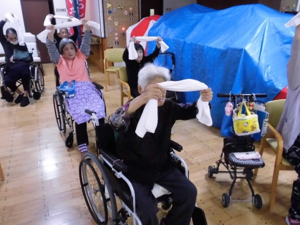 タオルを使用し、転びにくい体作りを目指します。