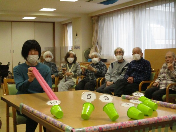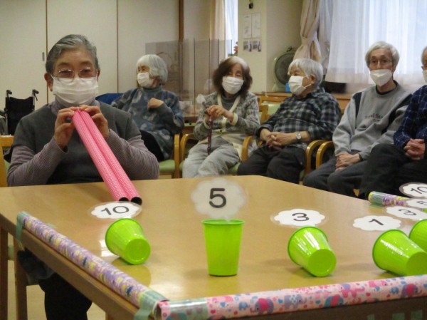 新しく開発しましたレクレーションですが皆さん慣れてこられました。2本の筒の間からミニボールを転がせて数字を付けて寝かせている