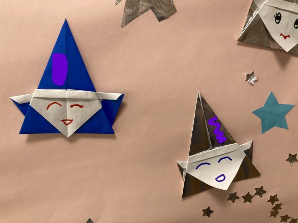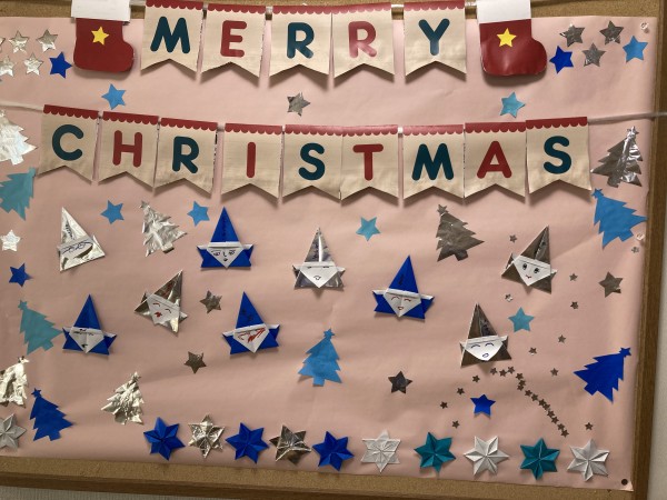 その後、折り紙で作ったサンタにお顔を描き、帽子のあたりに名前を書いていただきました。