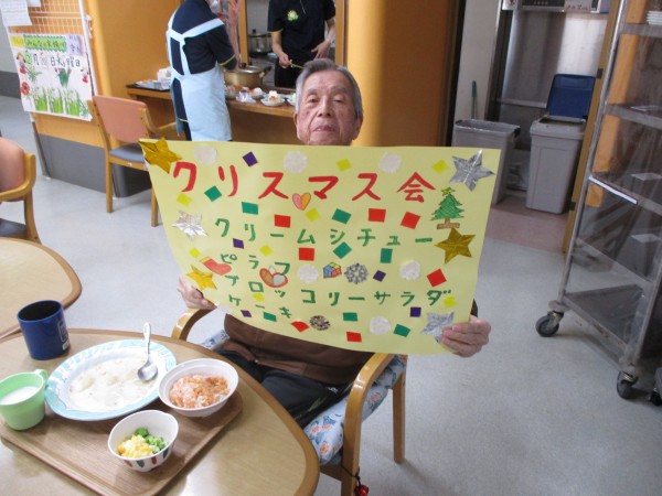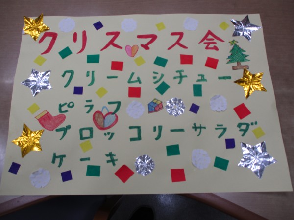 クリスマス会を行い、クリームシチュー・ピラフ・ブロッコリーサラダ・ケーキを食べました!
