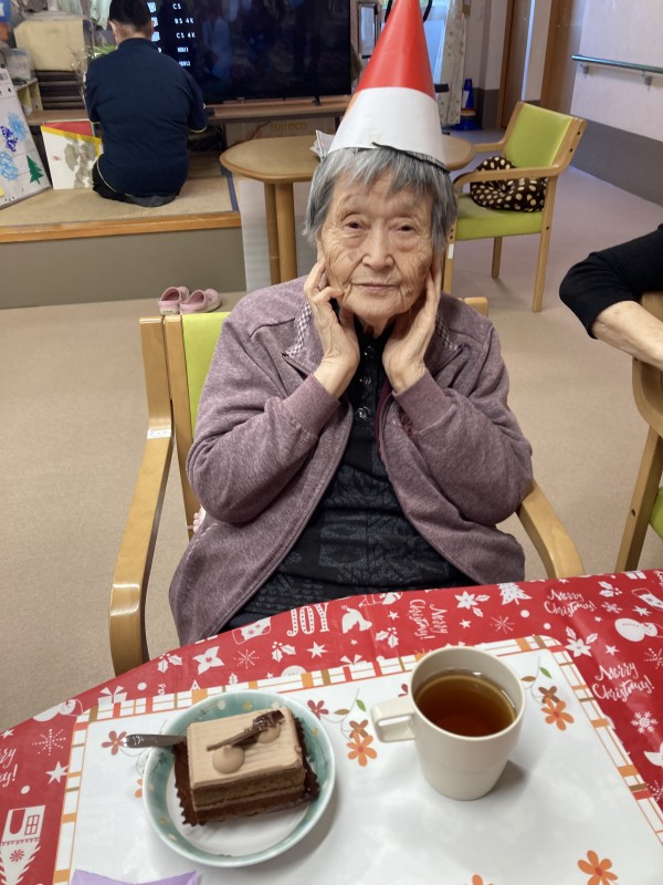 サンタの防止がとっても似合っていますね!美味しいケーキに笑顔がこぼれます。